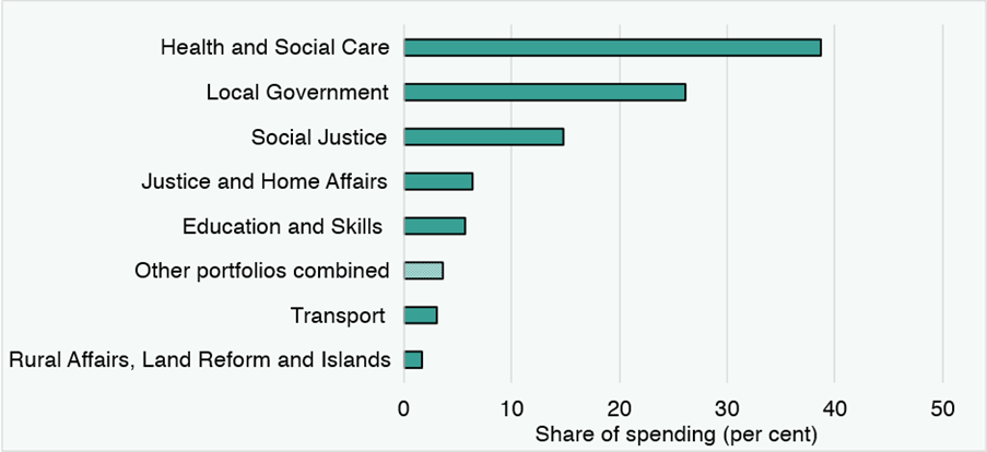 Figure 1 shows the proposed allocations for 2026-27 by Scottish Government portfolio for day-to-day spending covering running costs like staff pay and procuring goods and services. It shows how the 3 largest portfolios of Health and Social Care, Local Government and Social Justice (which includes social security spending) are set to make up around 80 per cent of the total discretionary day-to-day budget.