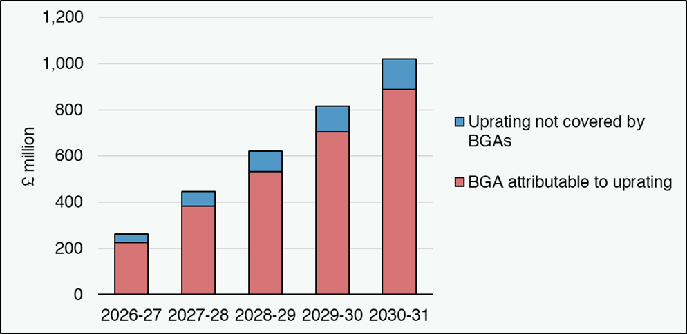 Figure 2 shows that most – around 85 per cent – of the cumulative cost of uprating is matched by growth in the BGAs that is because of uprating of benefits in England and Wales.