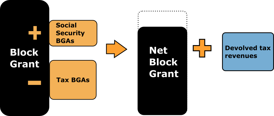 - How the “Block Grant” from the UK Government is adjusted for the devolution of social security and tax powers. These are known as Block Grant Adjustments (BGAs).